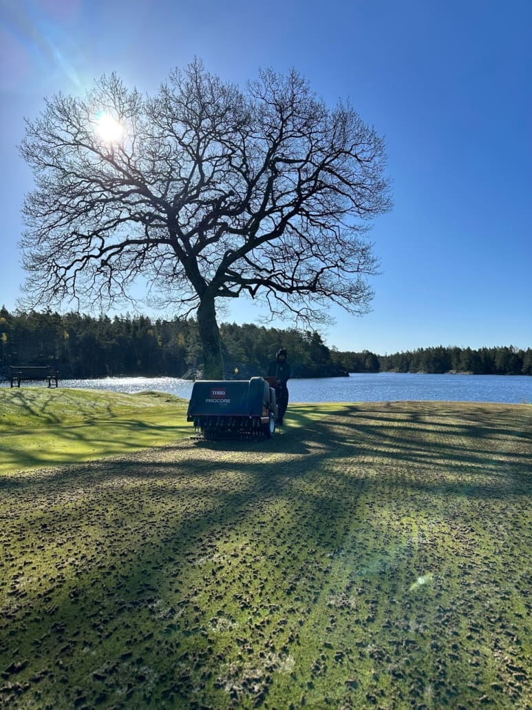 Full fart med både färdigställande av projekt och förberedelser inför kommande säsong! Det rullas gräs, stödsås, luftas, dressas och gödslas. Greener har täckts med dukar för att skydda mot kalla nätter samt driva tillväxt i skador. Även om vi gör allt vi kan för att påskynda läkningen av skadorna från vintern så har vi en bit kvar innan det är redo för öppning. Samtliga greener har skador, men cirka hälften av greenerna har omfattande skador från snömögel och behöver mer tid innan dom utsätts för slitage från spel. Vi håller tummarna för varma nätter och planerar för öppning av 18-hålsbanan 8/5